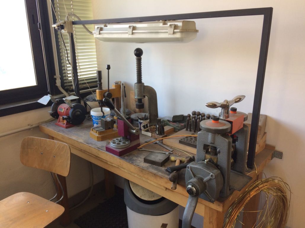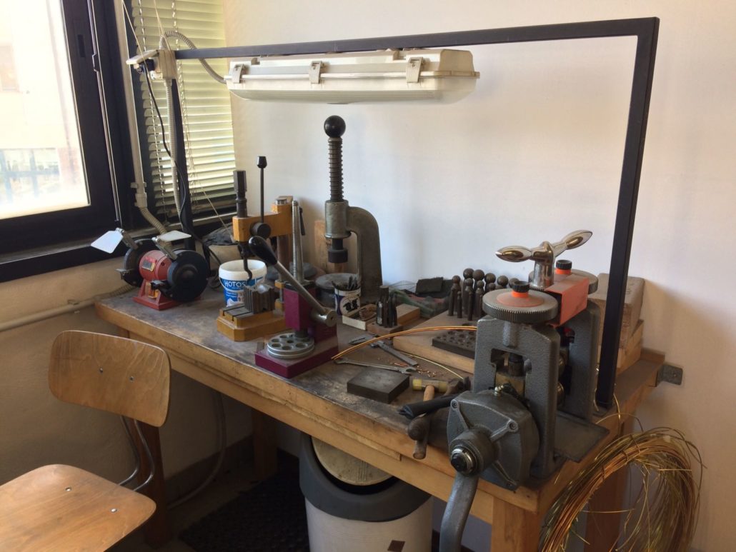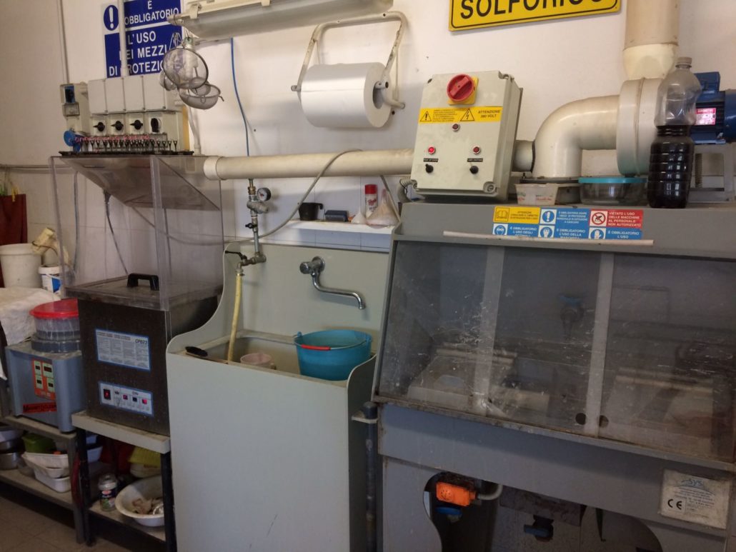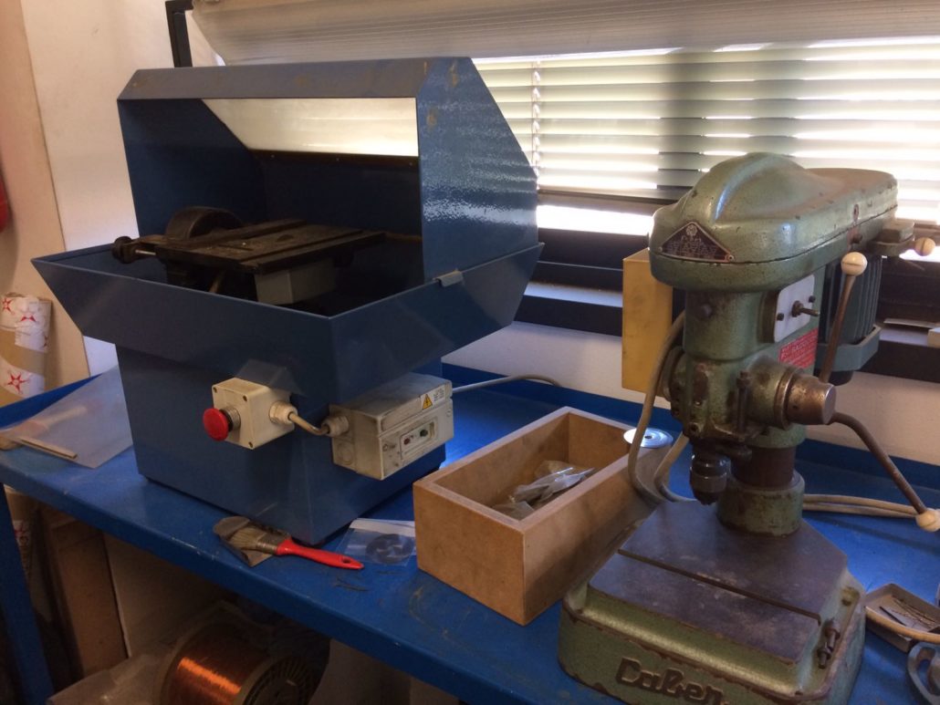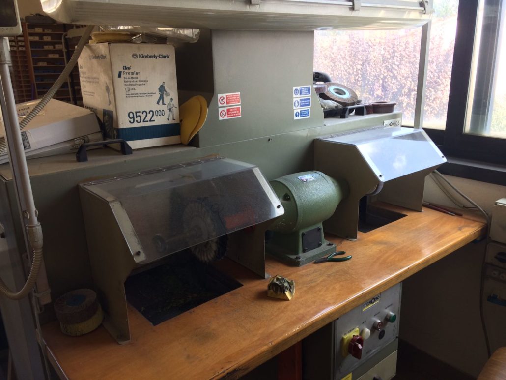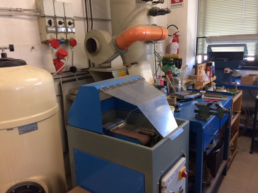Spianatrice a nastro, depuratore di acqua e banco con morsa.